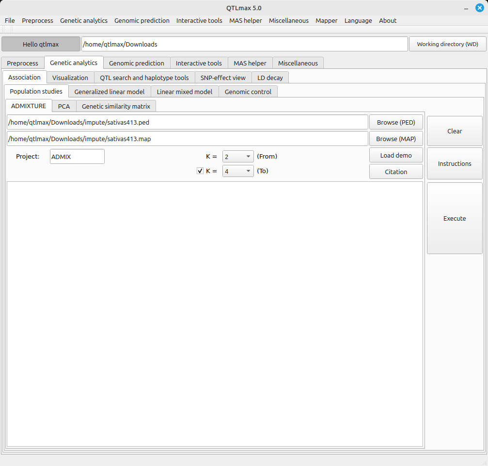 Figure 1 shows the Admixture tab page selected. On this tab page, you can choose the K values. The K value ensures that the entire population will be classified into K groups. If you want to iterate calculating the Admixture analyses from one K value to another greater one, please ensure that the given check box is checked, and select two K values.