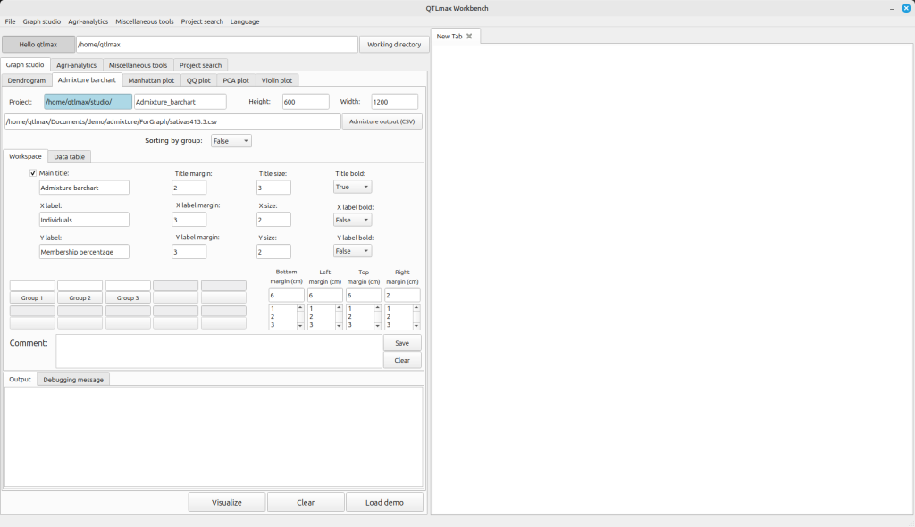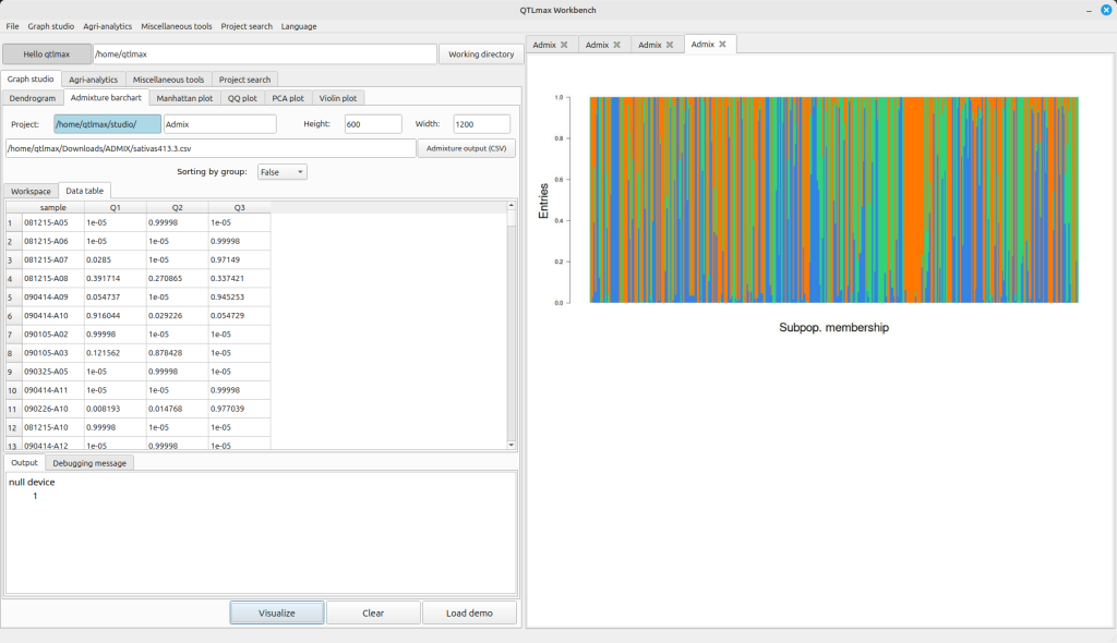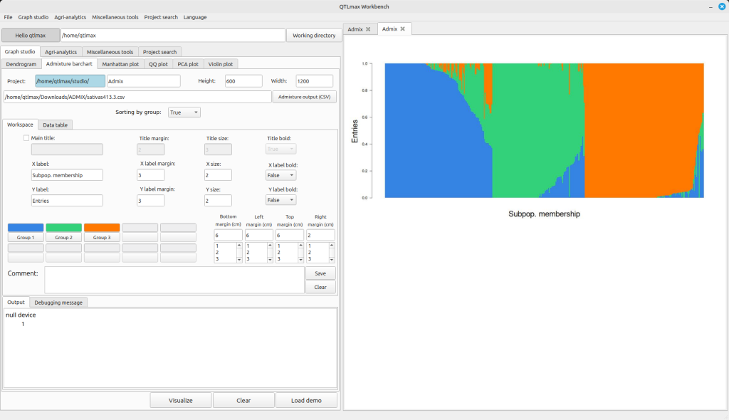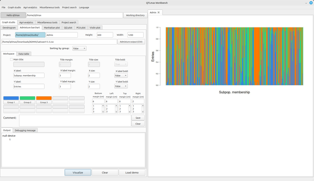 Figure 3 shows the Admixture Bar Chart tab page selected within QTLmax Workbench. This tab page offers many configuration options. If you don’t want to manually select each setting, simply click the [Load demo] button. You’ll see that most of the settings are configured automatically.