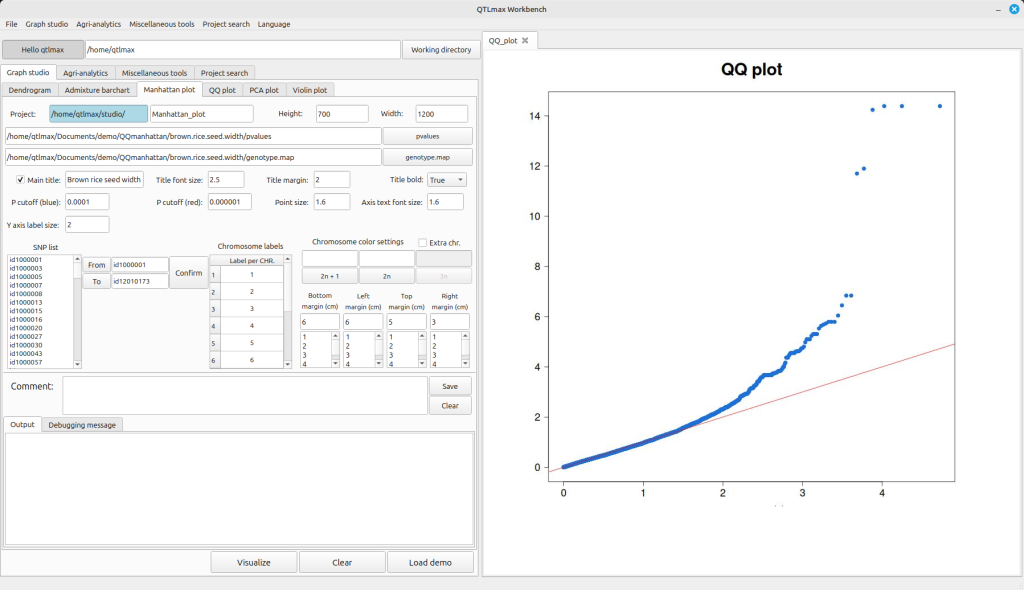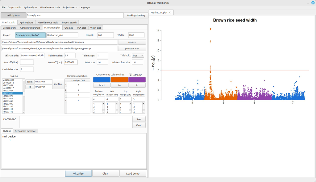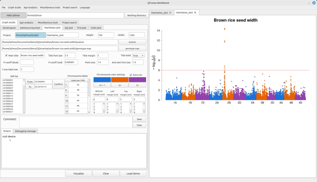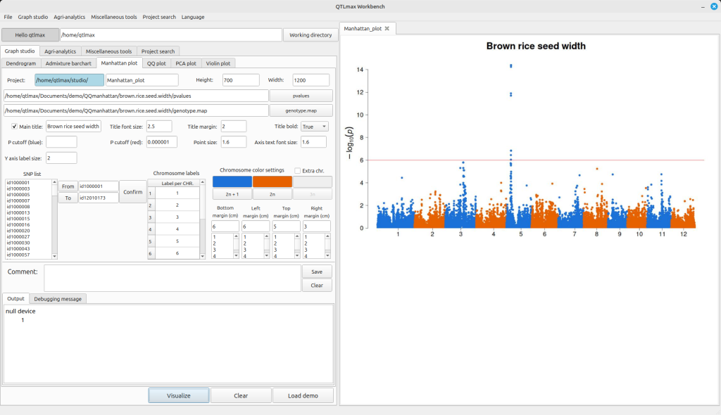 Figure 1 shows the Manhattan plot drawing tab selected in QTLmax Workbench. This tab has many settings options. If you don’t want to select each setting manually, just click the [Load demo] button. You’ll see that most of the settings are configured automatically. After replacing the demo data with your own, you’re free to change the settings to your desired values. Selecting colors for each chromosome is mandatory. Once all settings are finalized, click the [Visualize] button, and you’ll see the Manhattan plot generated (Figure 2).