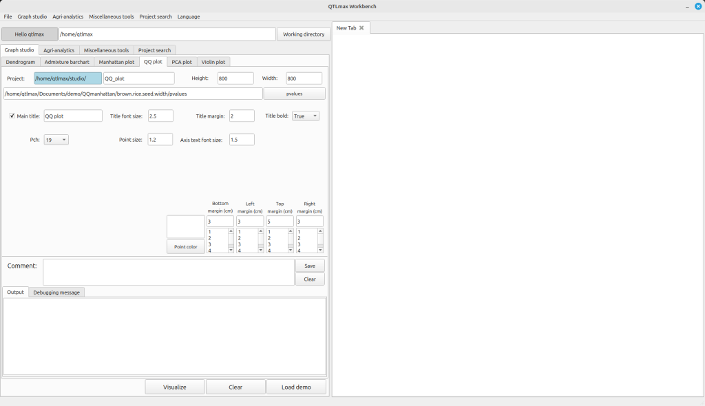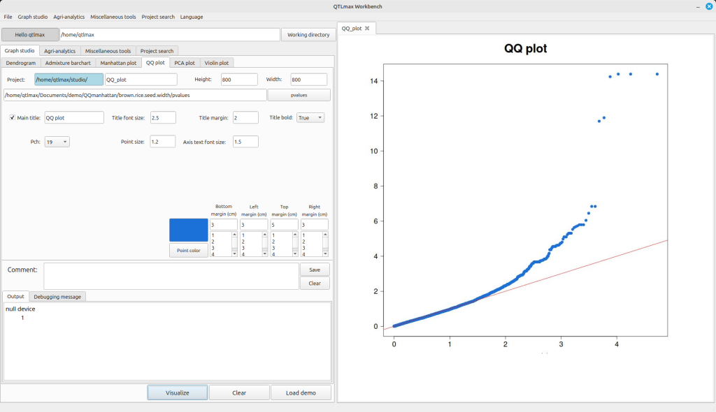Figure 1 shows the QQ plot drawing tab selected within the QTLmax Workbench program. This tab presents several configuration options. If you prefer not to select each setting individually, simply click the [Load demo] button; most of the settings will then be configured automatically. (Figure 1)