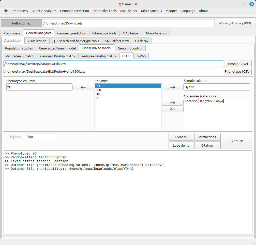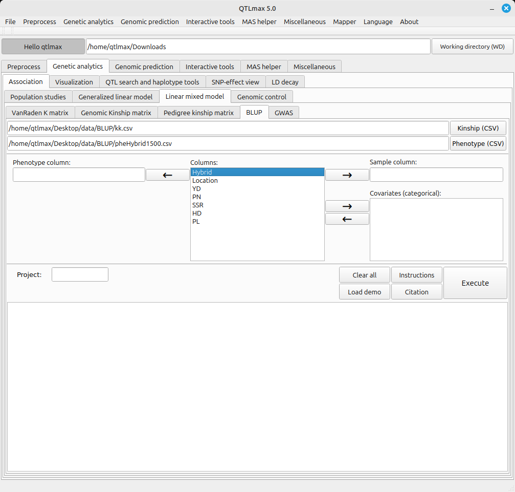 Figure 1 displays the BLUP tab page selected. After clicking the [Phenotype (CSV)] button and selecting a phenotype file in CSV format, the header values of the phenotype file will be listed in the “Columns” text box. (Figure 1)