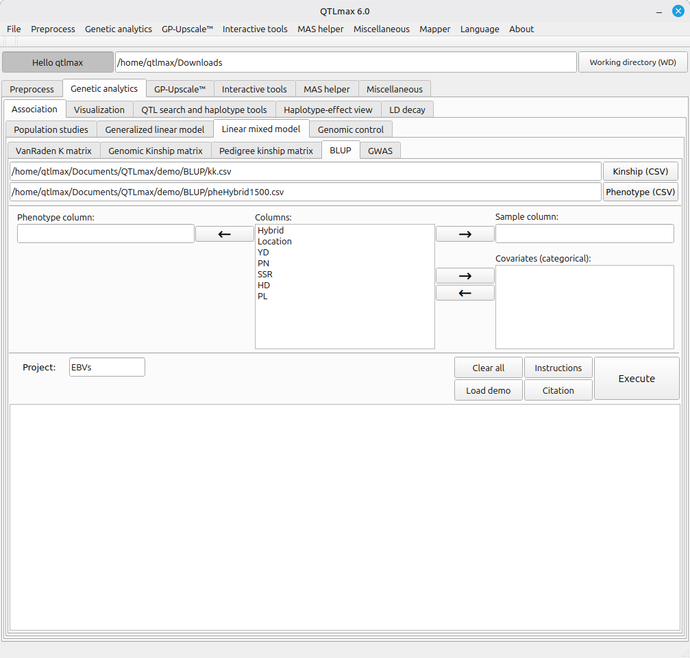 Figure 1 displays the BLUP tab page selected. After clicking the [Phenotype (CSV)] button and selecting a phenotype file in CSV format, the header values of the phenotype file will be listed in the “Columns” text box. (Figure 1)
