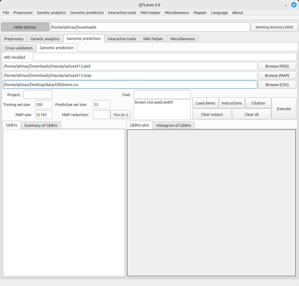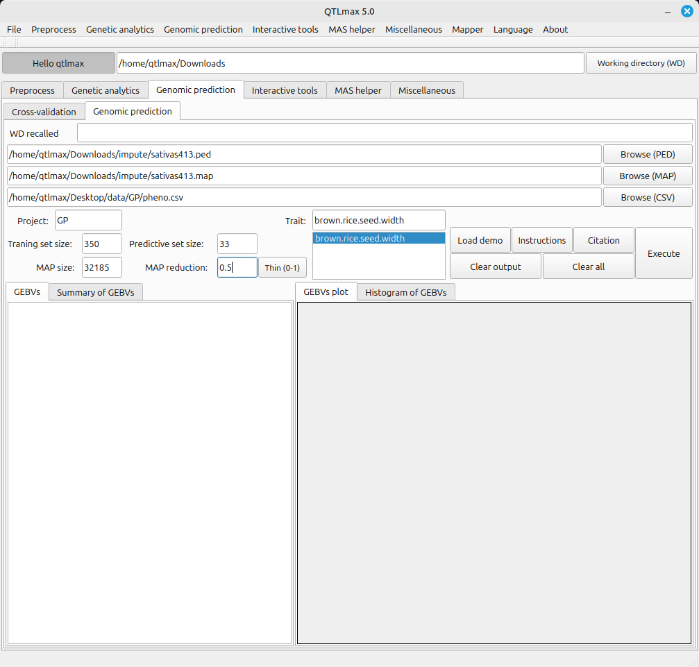 Figure 2 displays all the configured settings for Genomic Prediction. A Map reduction of 0.5 is shown, meaning that a half of all markers are subject to being in use by pressing the [Thin (0-1)] button. After completing all settings, clicking the [Execute] button will start the Genomic Prediction process.