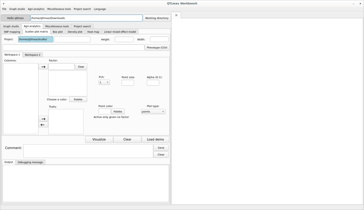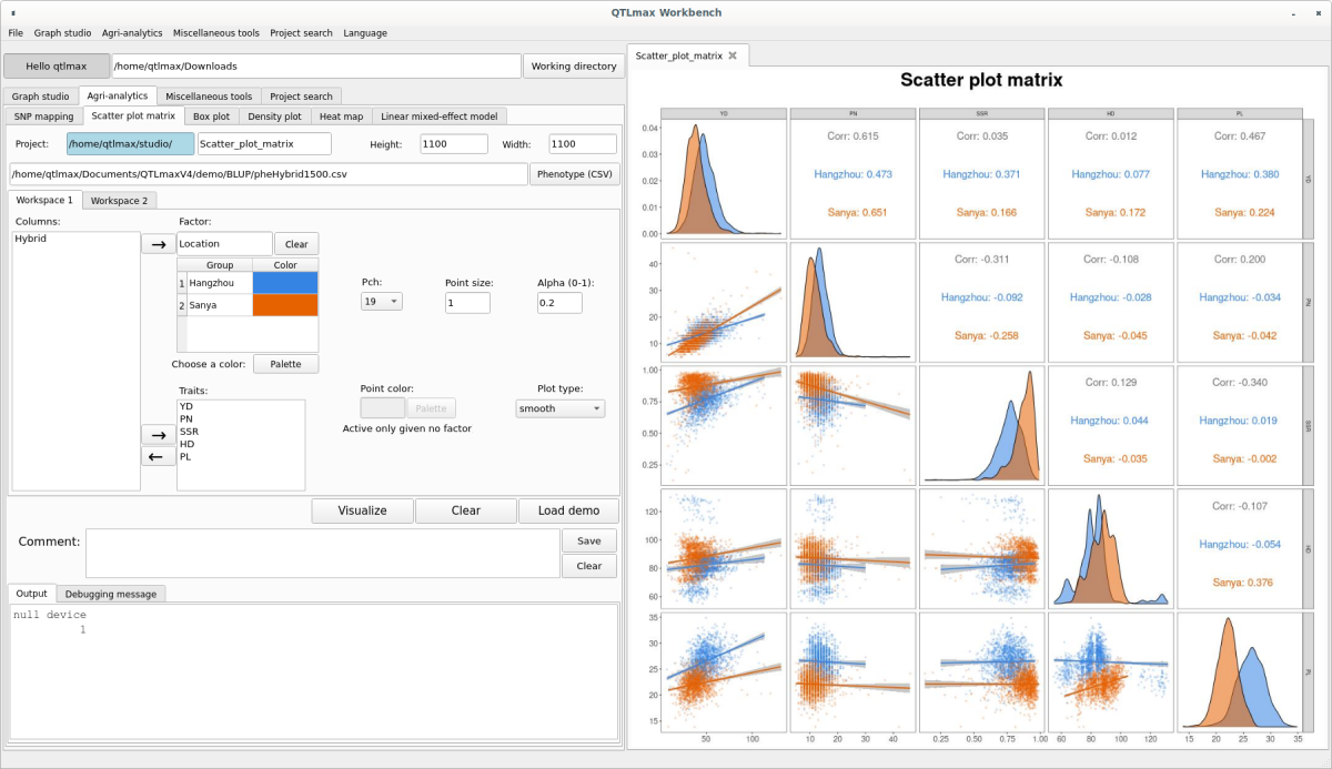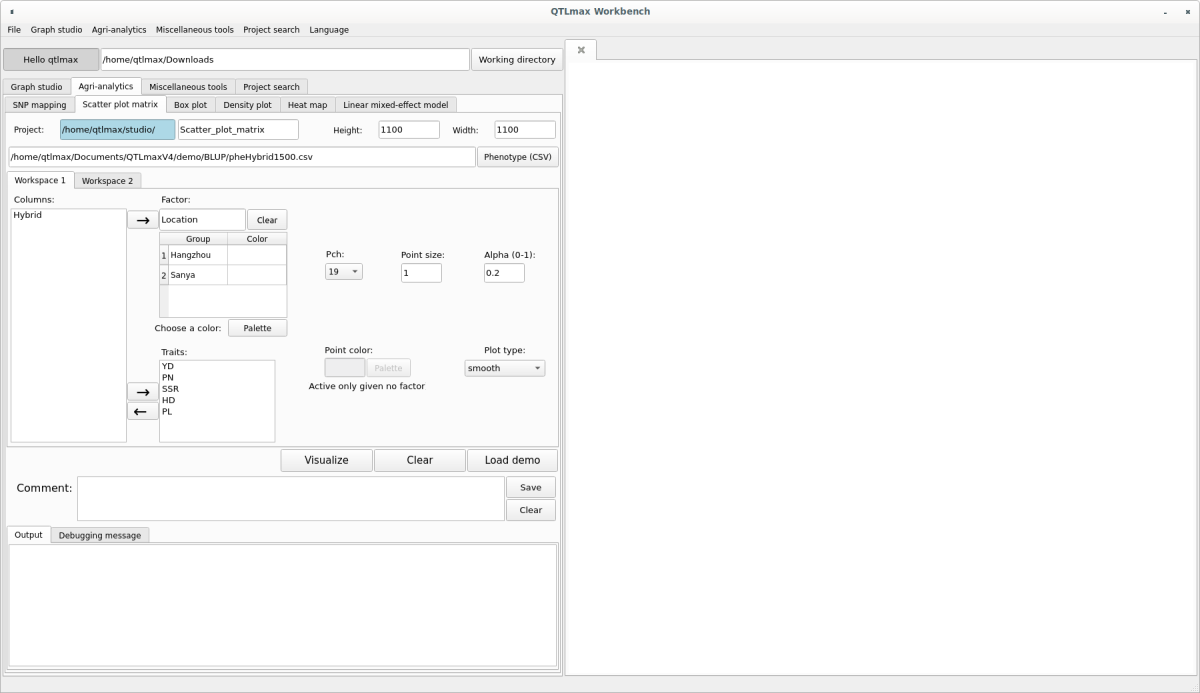 The “Scatter Plot Matrix” tab has many configuration options. If you don’t want to select each setting individually, simply click the [Load demo] button. You’ll see most of the settings are automatically configured (Figure 2). The input data format is a CSV (*.csv) file containing multiple phenotypic information. After replacing the demo data with your own, you can freely change the settings to your desired values.