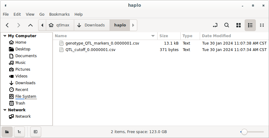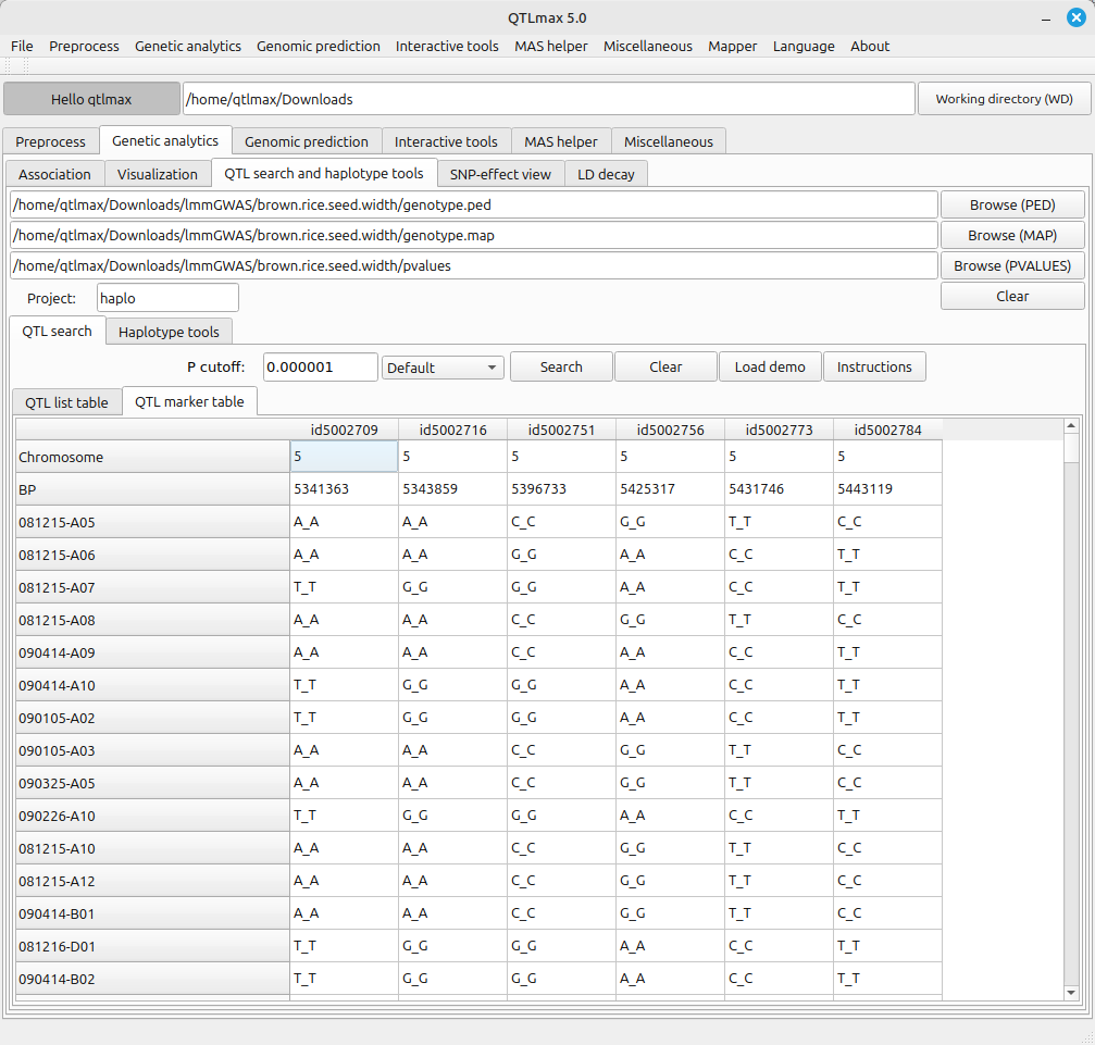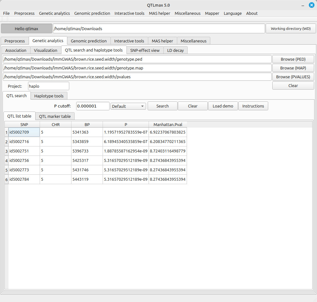 Figure 1 shows the “QTL search and haplotype tools” tab page selected within QTLmax. Press the [Browse (PVALUES)] button to open the file explorer. Navigate to the project folder containing the GWAS result file. When you select the pvalues file in that folder, all input files will be automatically loaded (Figure 1).