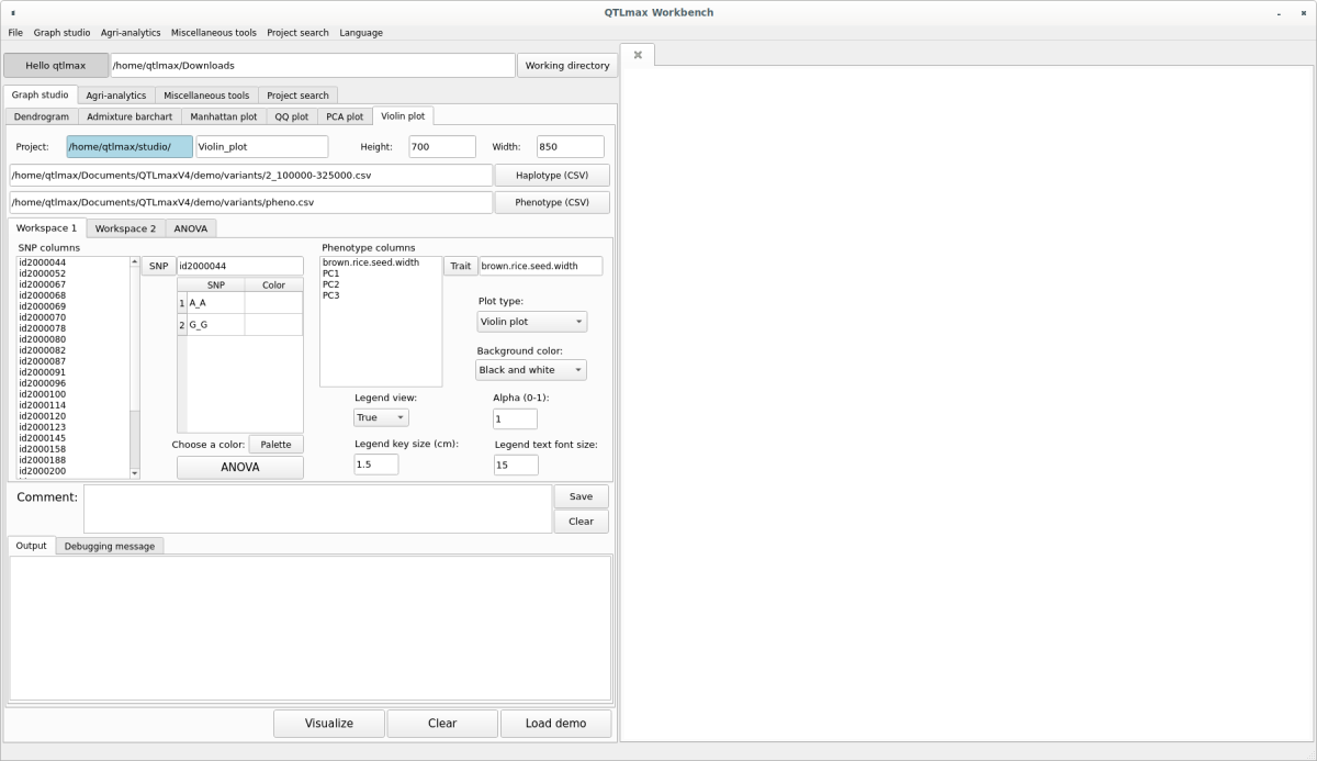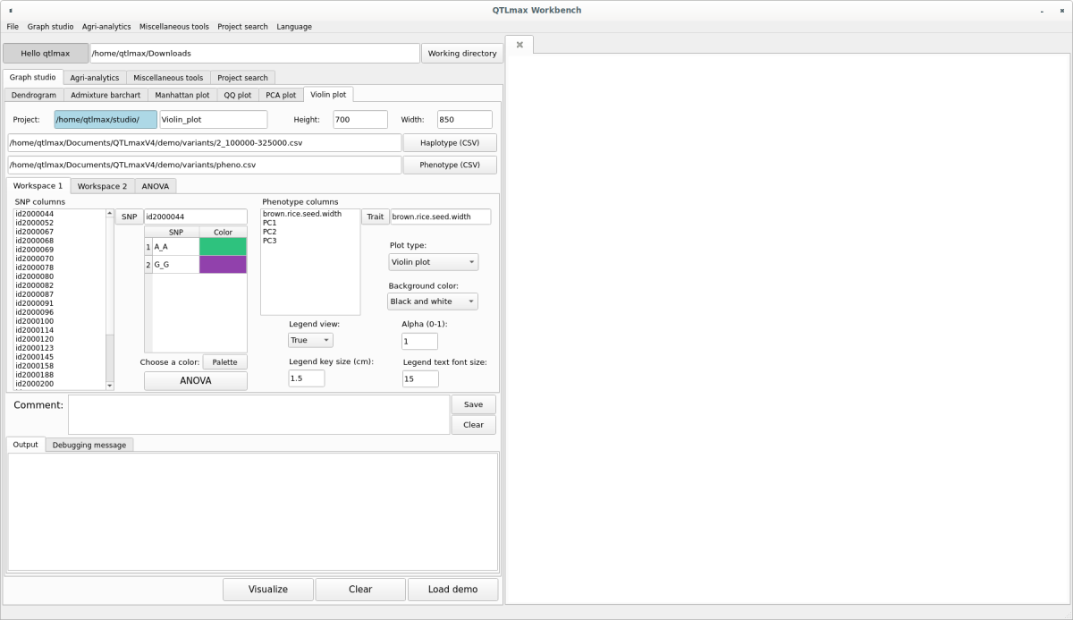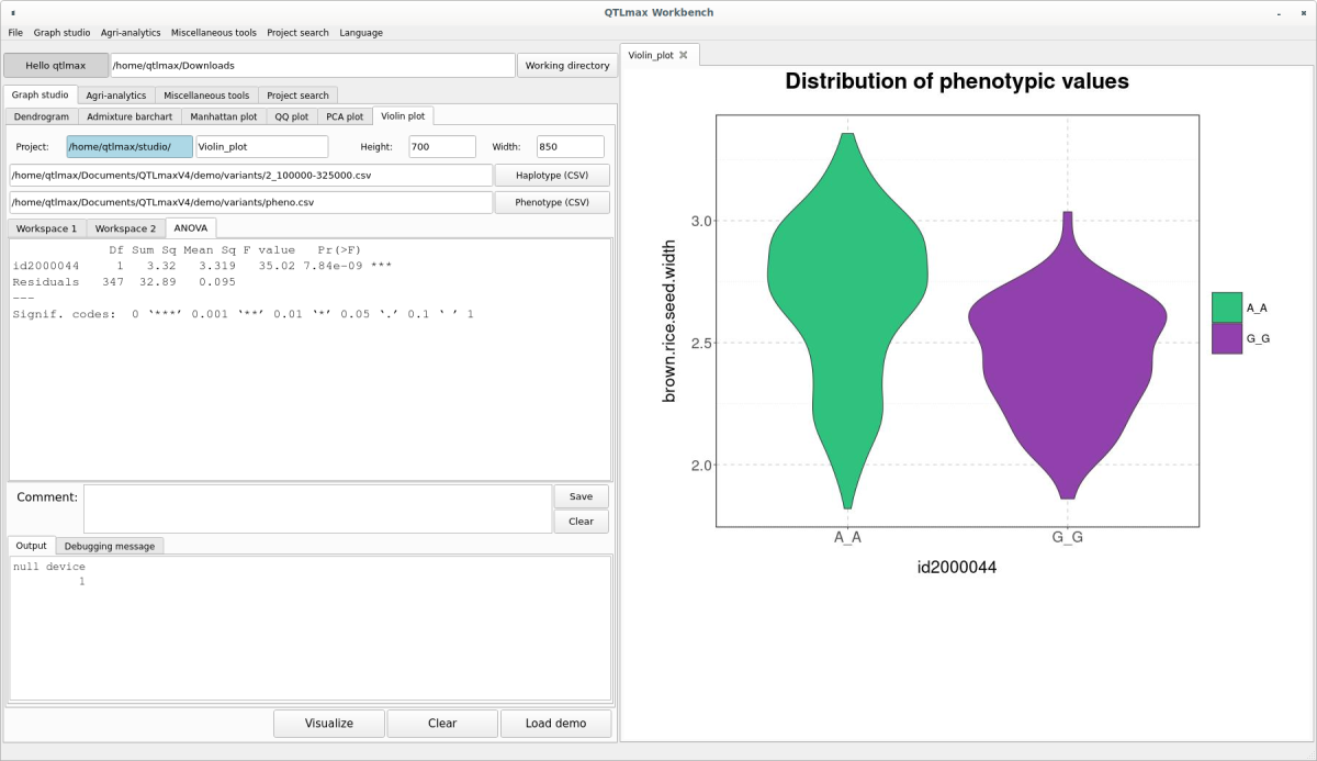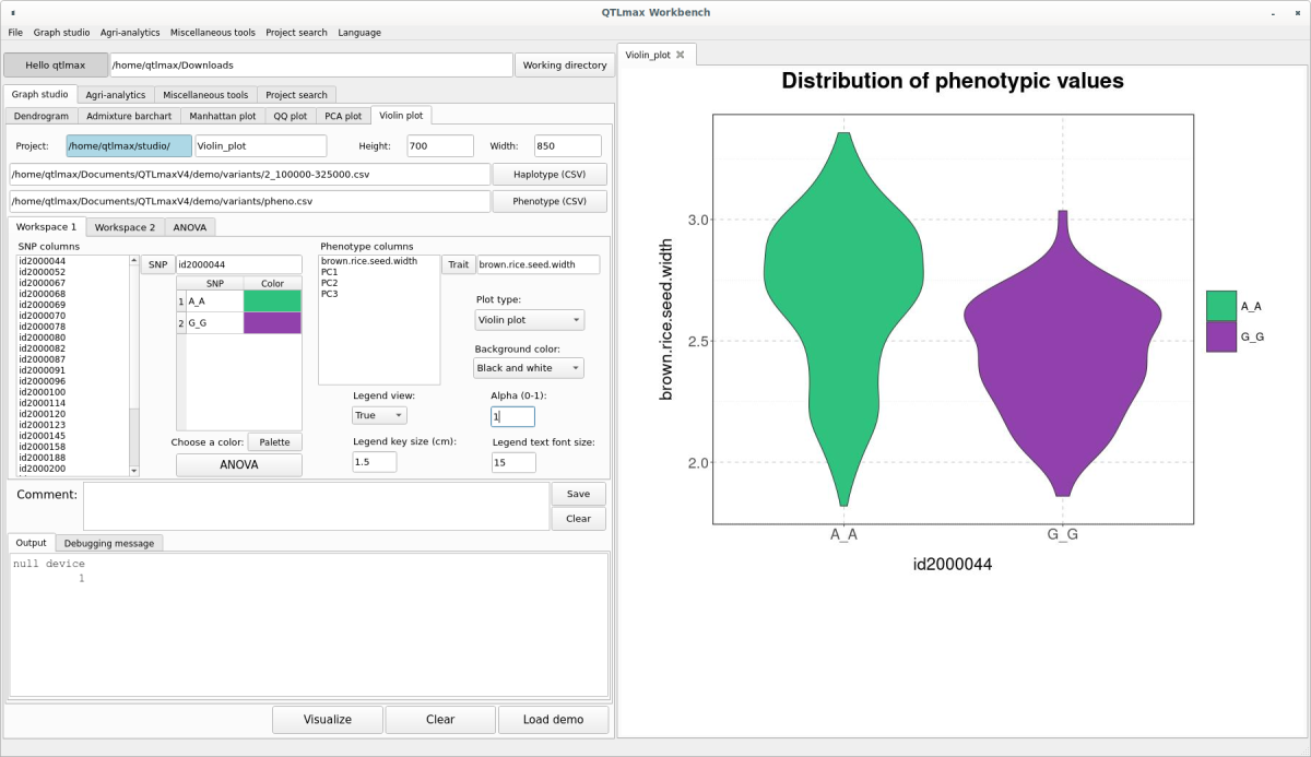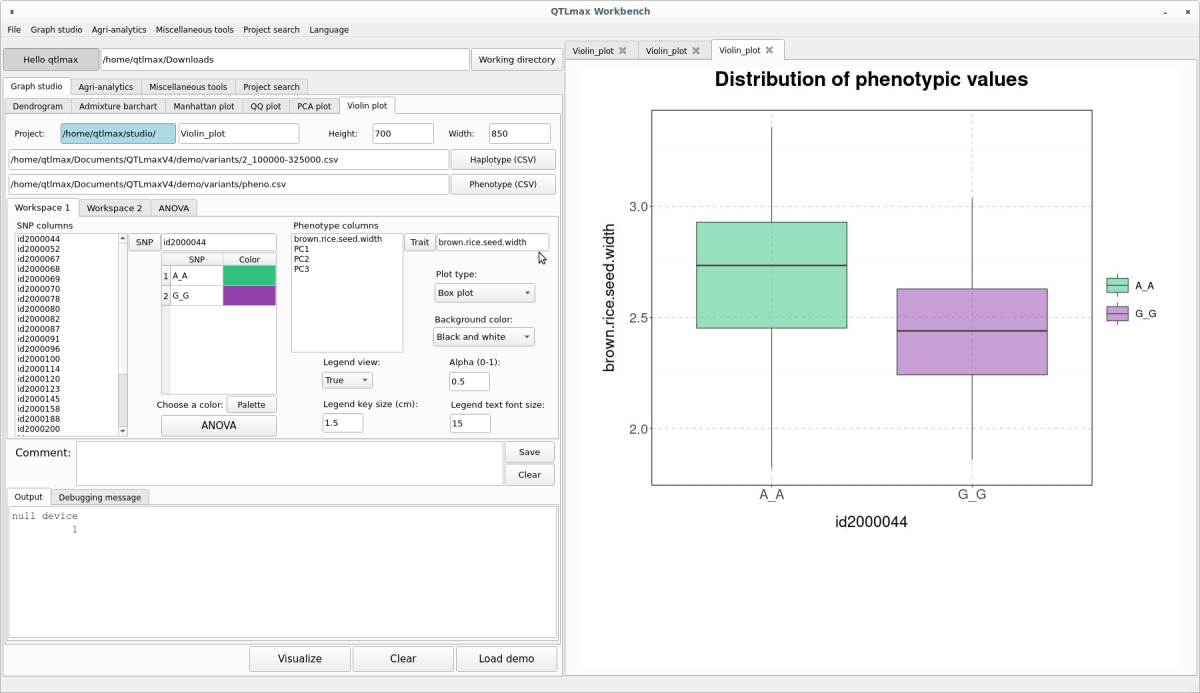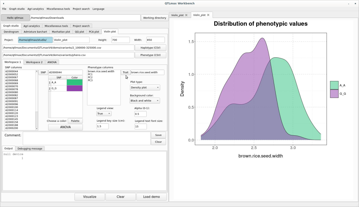 Figure5 shows the “Violin plot” tab page selected within the QTLmax Workbench. The “Violin plot” tab page has many setting options. If you don’t want to select each setting option individually, just click the [Load demo] button. You’ll see that most of the setting options are configured automatically (Figure 5). You can freely change the settings to your desired values.