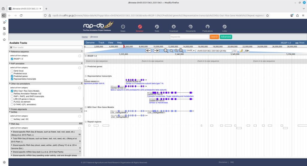 The field labeled with “P cutoff” is for a P value threshold value to define QTL; the fields labeled with “Left margin (bp)” and “Right margin (bp)” define the window size by adding the left and right distances from a QTL marker (SNP). The combo box under the “Gbrowse servers” shows a list of gbrowse database servers. You can select a database upon a crop species you are working on. With all settings configured, pressing the [Execute] button will pop up a web browser as shown in Figure 2. Alongside with it, an item relevant to this work will be additionally listed as shown in Figure 1; each created item is clickable, allowing you to revisit the results later as needed.