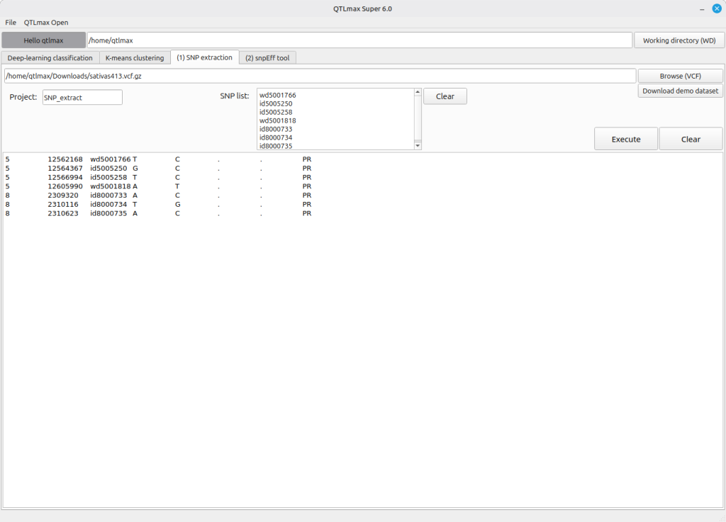 Figure 1 shows the tab page called “(1) SNP extraction” for the first step, in which you are required to enter a list of SNP names to extract from a given input file in a VCF or VCF.GZ format. In real practice, your list of SNPs would be made up of QTL markers resulting from GWAS. The resulting output will be displayed in the output box. Please note that its resulting file will be used in the next step.